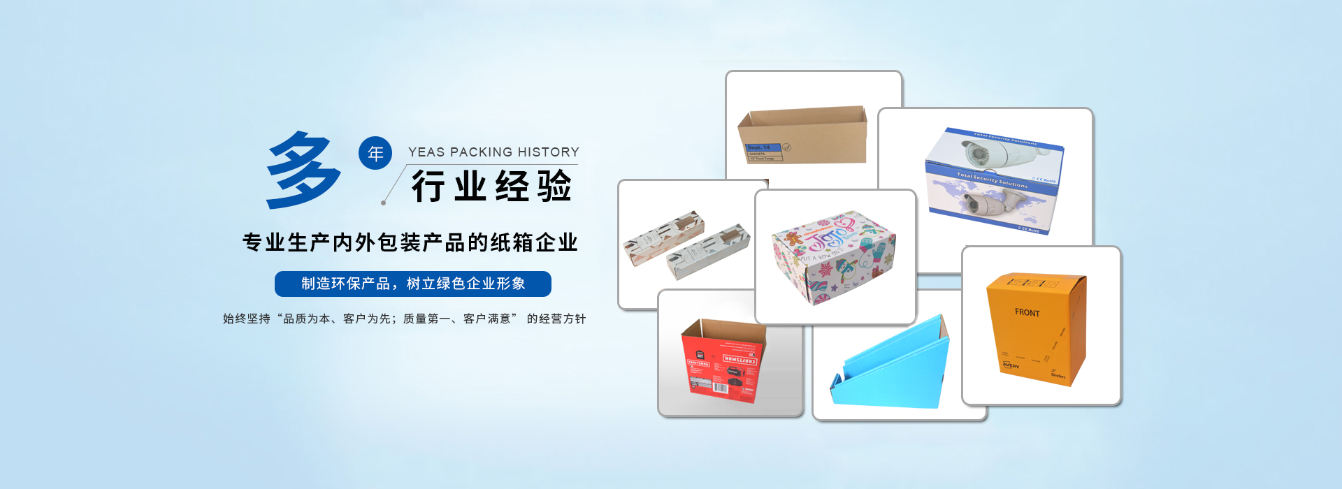 我司主要生產(chǎn)瓦楞紙箱、隔板,禮品盒、彩盒,啤盒;啤卡 ,紙護(hù)角 ,紙卡板,說明書,不干膠,珍珠棉,輔助包材集生產(chǎn)和銷售于一體;公司在材料采購(gòu)、生產(chǎn)控制、成品檢驗(yàn)、售后服務(wù)包裝需求嚴(yán)格執(zhí)行ISO9001質(zhì)量體系標(biāo)準(zhǔn);我公司目前為SONY,欣旺達(dá)電子,嘉盛照明,庫(kù)偉實(shí)業(yè),洲明節(jié)能科技; 泛美照明科技, 怡化金融設(shè)備,美利龍餐具,中天世紀(jì),東芝電器 ,共進(jìn)電子等大中型企業(yè)公司配套供應(yīng)包裝紙箱,建立了穩(wěn)定的合作關(guān)系。